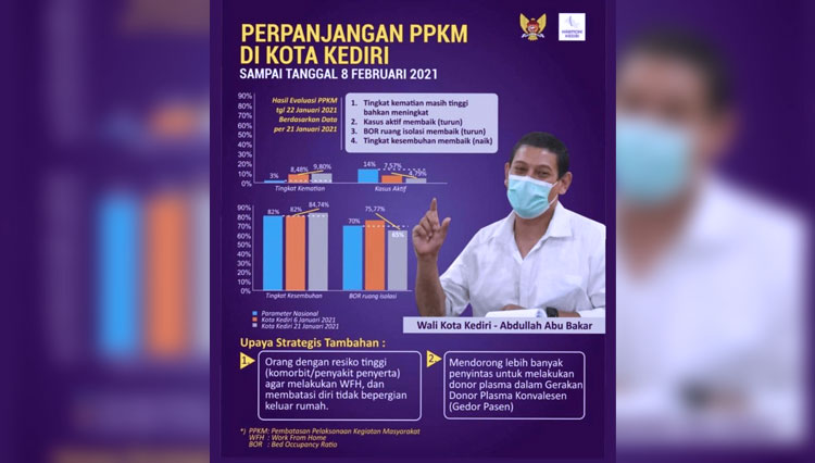 Wali Kota Kediri menyampaikan Pemkot Kediri memperpanjang PPKM hingga 8 Februari 2021 dengan dua upaya strategis tambahan. Pertama, orang dengan komorbid agar melakukan work from home (WFH) dan membatasi diri tidak berpergian keluar rumah. Kedua, mendorong lebih banyak penyintas covid-19 untuk melakukan donor plasma dalam Gerakan Donor Plasma Konvalesen (Gedor Pasen).
