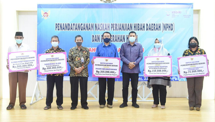 Wali Kota berfoto bersama penerima hibah (Foto: Protokol dan Komunikasi Pimpinan Sekretariat Daerah Kota Kediri)Dalam kesempatan tersebut, Wali Kota Kediri Abdullah Abu Bakar yang didamdingi Plt Kabag Kesra Ardi Handoko juga menyerahkan secara simbolis bantuan hibah untuk 20 lembaga keagamaan meliputi lembaga masjid, mushola, gereja, pokmas dan ormas penerima hibah Tahun 2021.